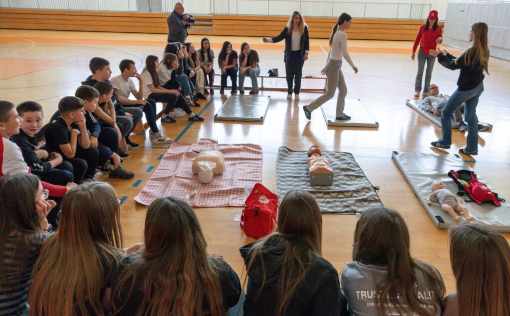 Školski tim Crvenog križa pod vodstvom učiteljice tjelesne i zdravstvene kulture Ane Deković i uz pomoć Kristine Boljat iz kaštelanskog Crvenog križa demonstrirali su učenicima šestih i sedmih razreda kako se pruža prva pomoć.