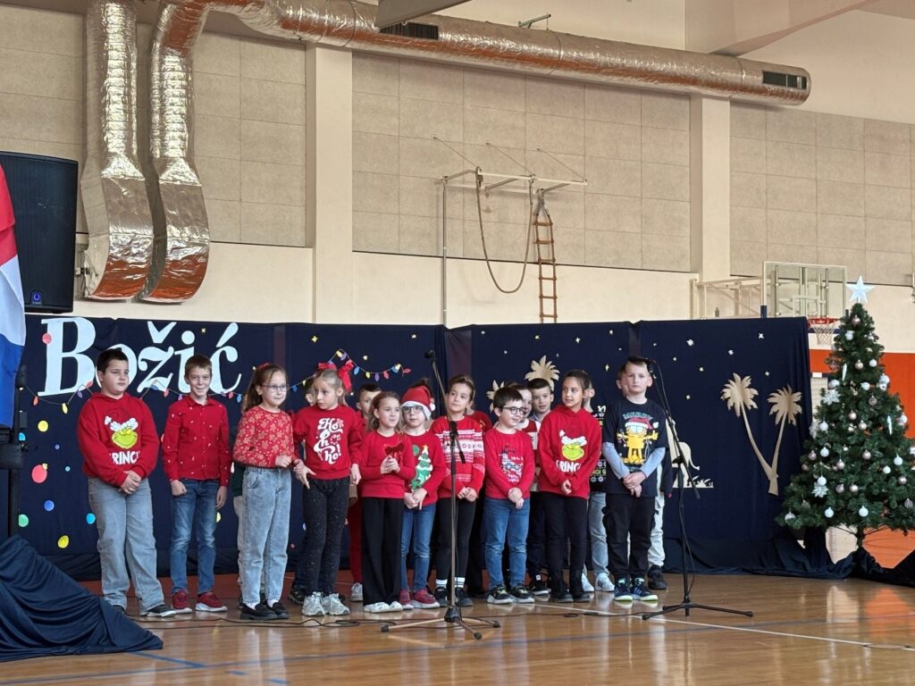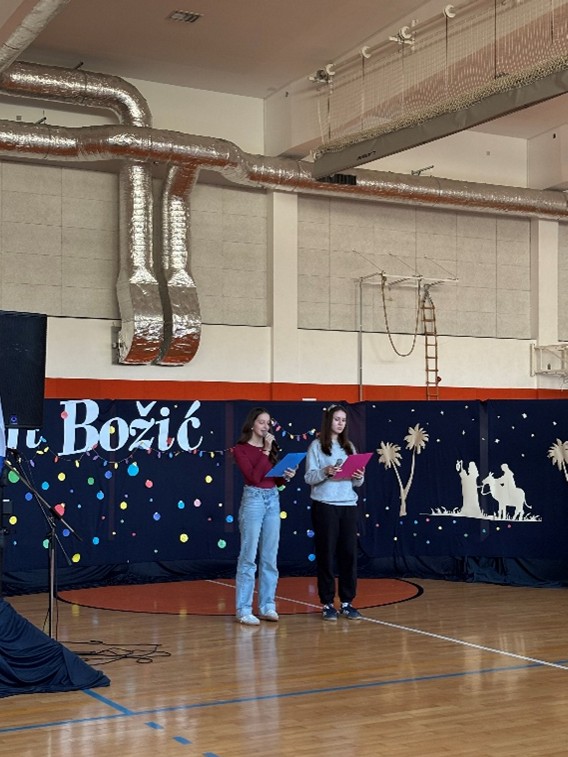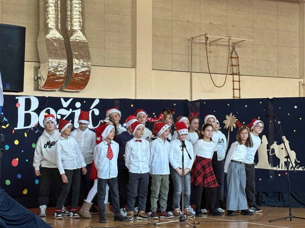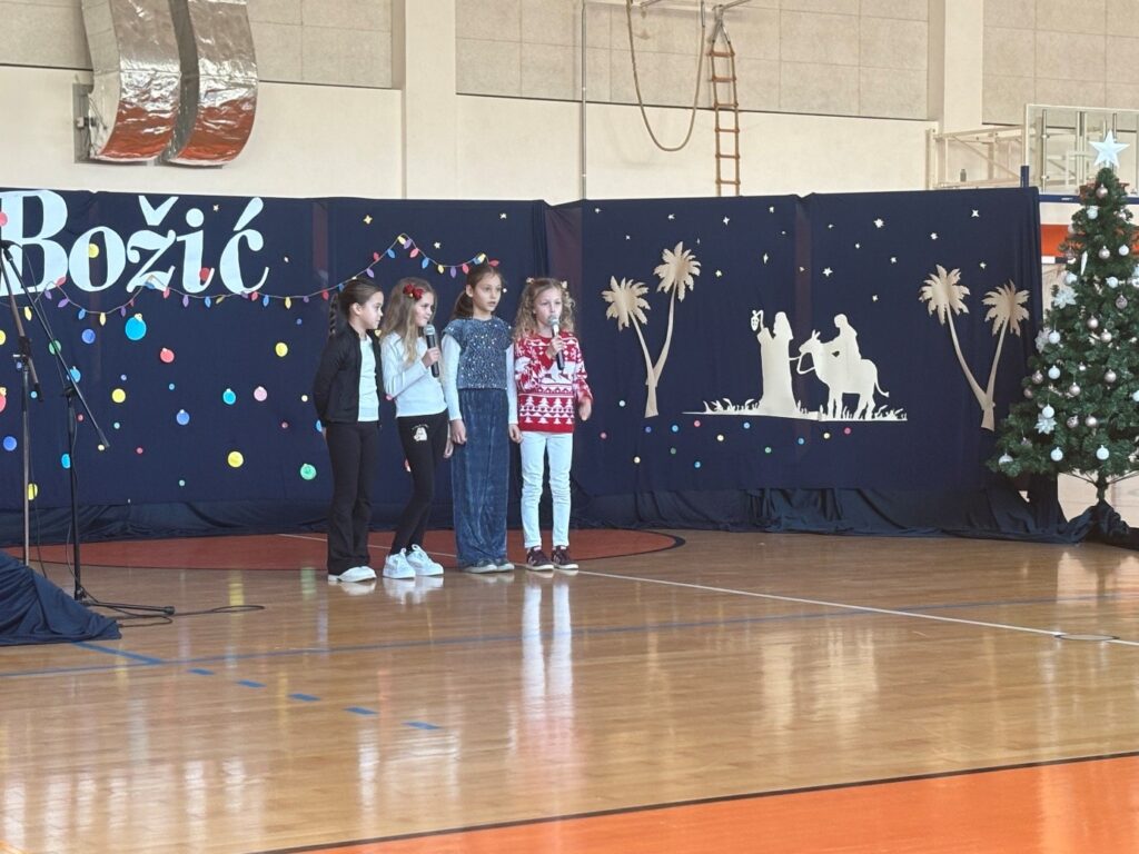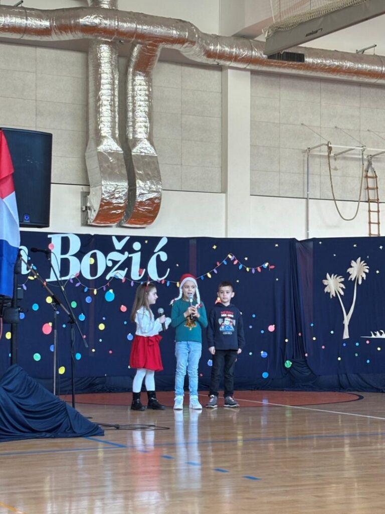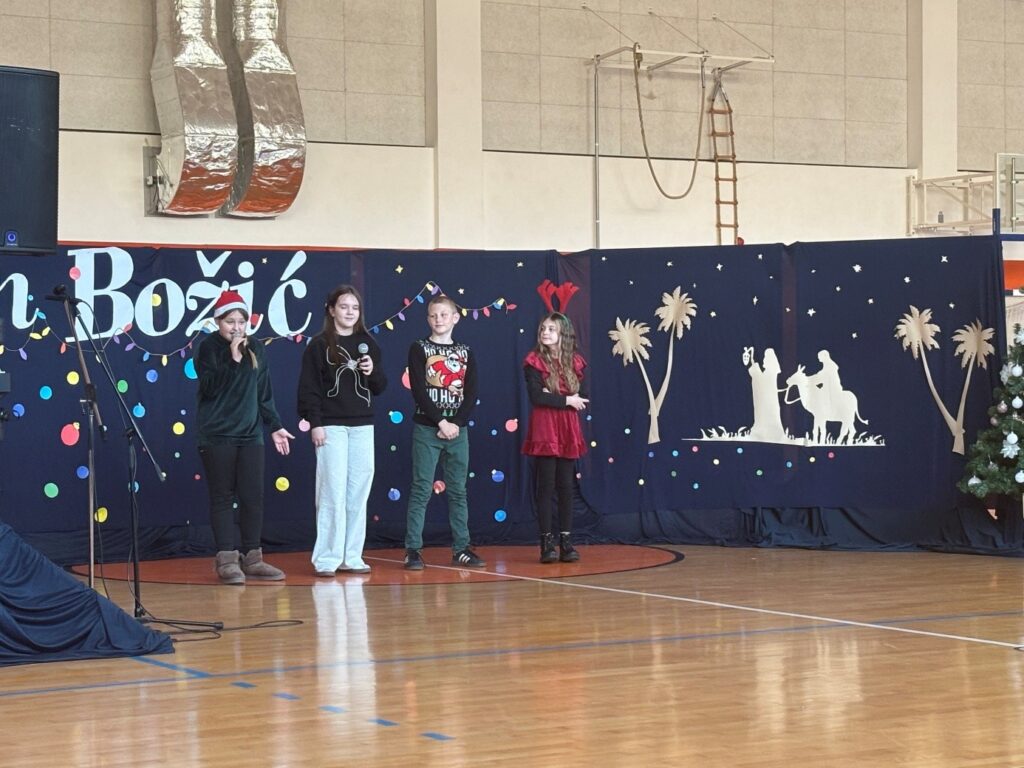 U prepunoj školskoj dvorani 22. prosinca 2025. održana je tradicionalna božićna priredba koja je okupila učenike, roditelje i djelatnike škole. Prepuna dvorana bila je dokaz koliko su ovakvi susreti važni i rado posjećeni. Bogat i raznolik program vodile su Nina Budiša i Nora Gracin, učenice 8. d razreda, koje su publiku provele kroz večer ispunjenu pjesmom, recitacijama i igrokazima.