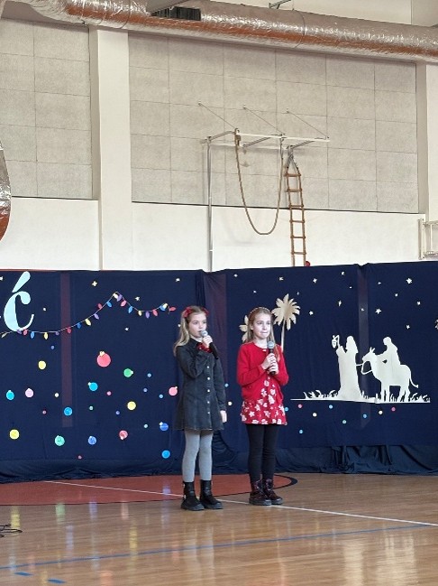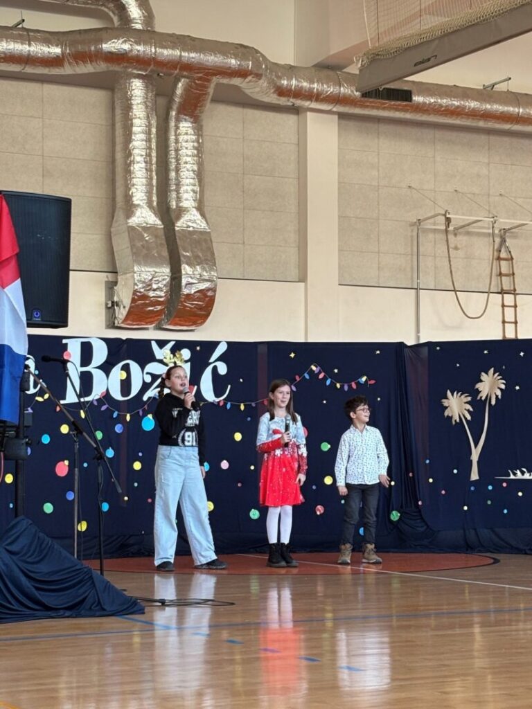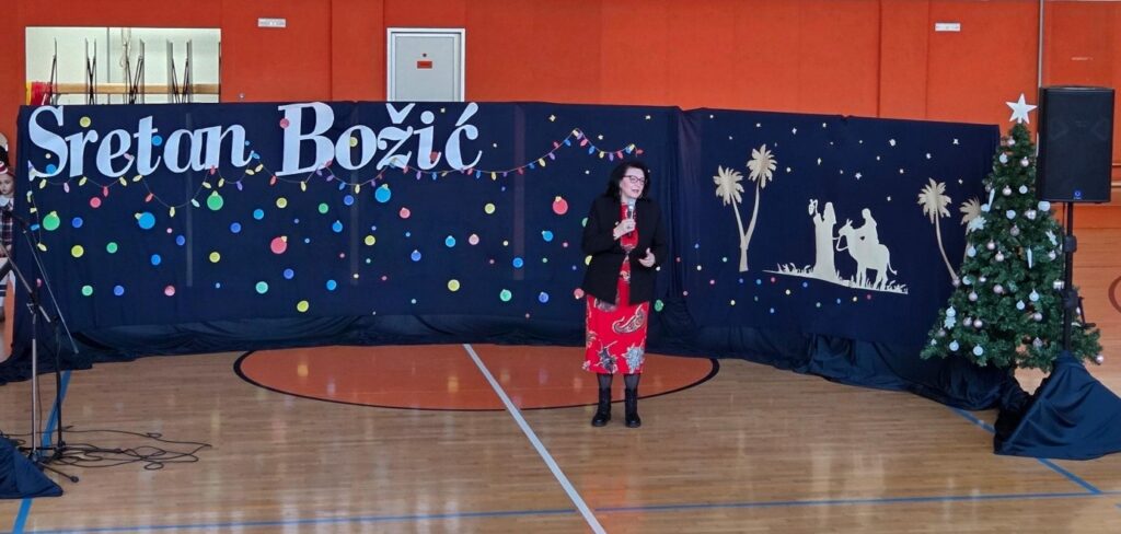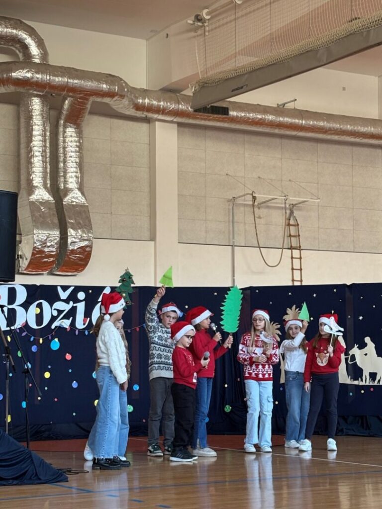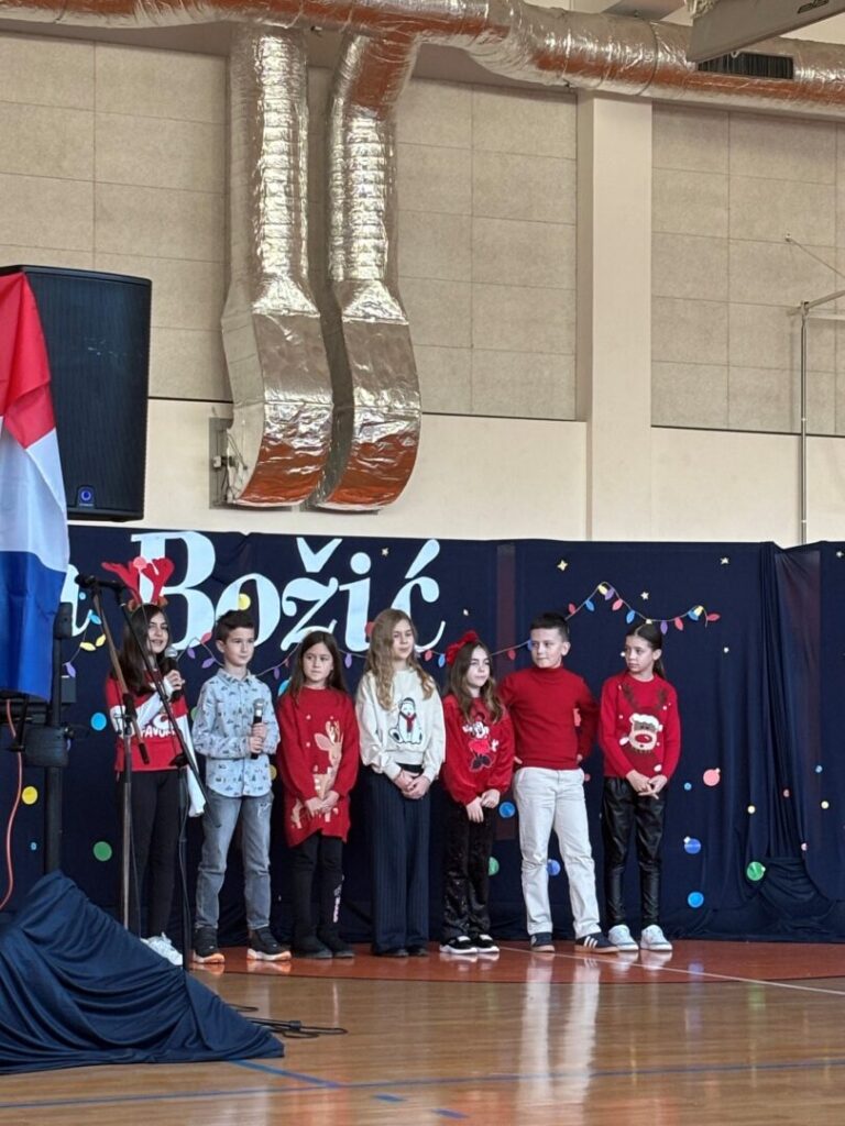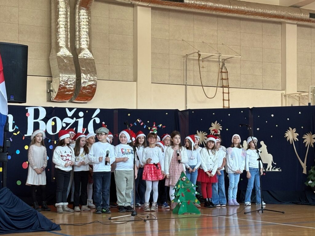 U prepunoj školskoj dvorani 22. prosinca 2025. održana je tradicionalna božićna priredba koja je okupila učenike, roditelje i djelatnike škole. Prepuna dvorana bila je dokaz koliko su ovakvi susreti važni i rado posjećeni. Bogat i raznolik program vodile su Nina Budiša i Nora Gracin, učenice 8. d razreda, koje su publiku provele kroz večer ispunjenu pjesmom, recitacijama i igrokazima.