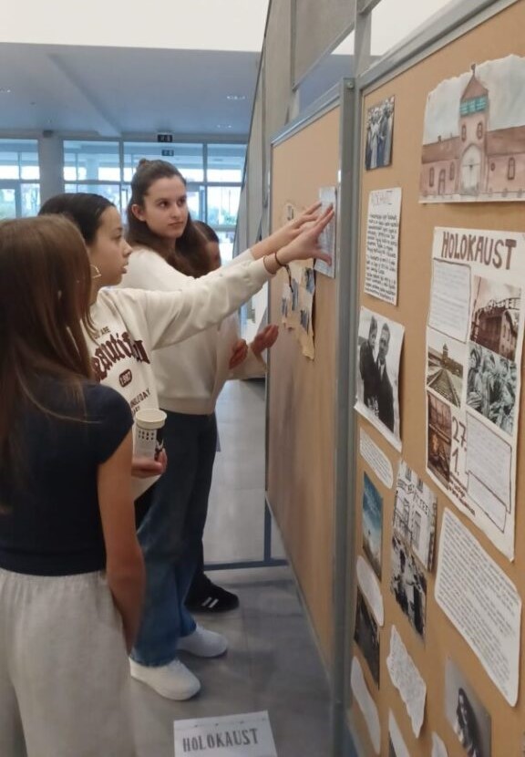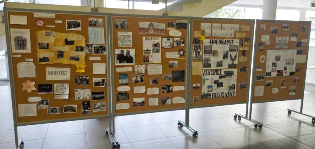 U sklopu obilježavanja Međunarodnog dana sjećanja na žrtve holokausta, učenici osmih razreda izradili su prigodne plakate i pripremili materijale za izradu velikog edukativnog panoa u predvorju škole. Pano s učeničkim radovima postavili su učenici 8.a i 8.b razreda.