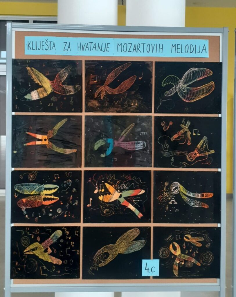 Učenici 4.c razreda su kroz likovni izričaj dočarali načine hvatanja glazbe. Radovi na temu Kliješta za hvatanje Mozatovih melodija izloženi su u predvorju škole.