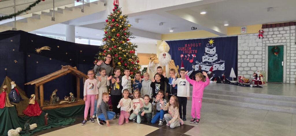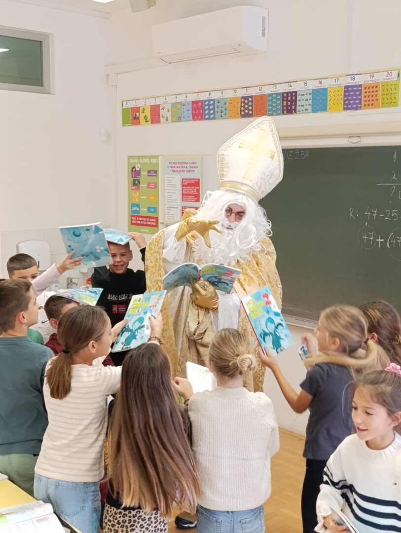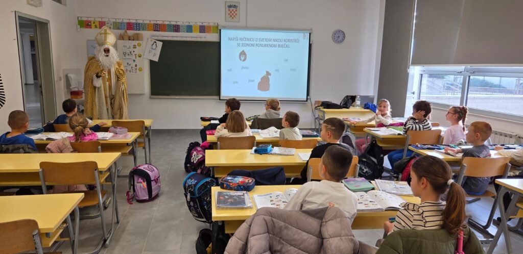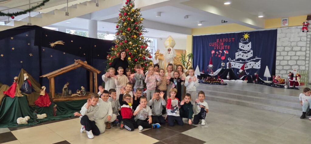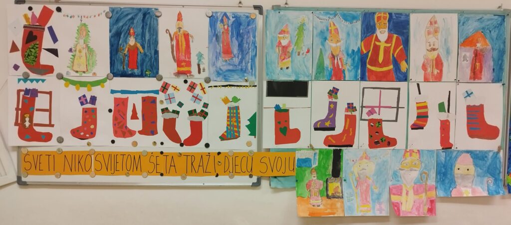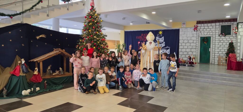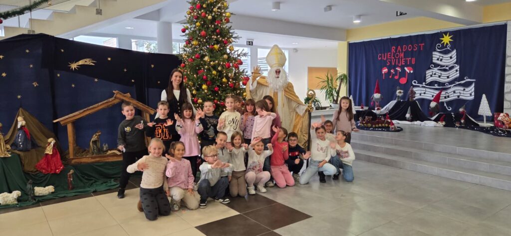 Povodom njegova blagdana, našu je školu posjetio upravo Sveti Nikola te je svojim dolaskom razveselio velike i male. Obišao je učenike u učionicama, srdačno ih pozdravio i s radošću se fotografirao s njima. Naši su se mališani posebno veselili susretu, a osmjesi su ispunili čitave hodnike. Sveti Nikola nije došao praznih ruku – svakom je učeniku darovao simboličan bombon, šireći dobro raspoloženje i toplinu. Učenici su se za njegov dolazak pripremili s velikim entuzijazmom. Kreativnim su radovima ukrasili svoje razredne panoe, posvetivši ih upravo svetom Nikoli. Crteži, poruke i prigodni ukrasi dali su školi blagdanski sjaj i stvorili posebno svečanu atmosferu.