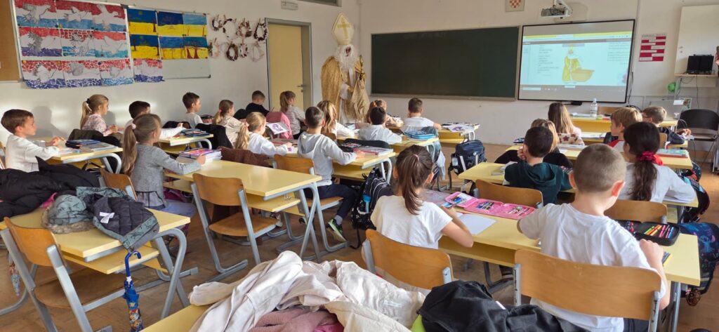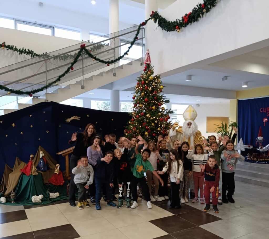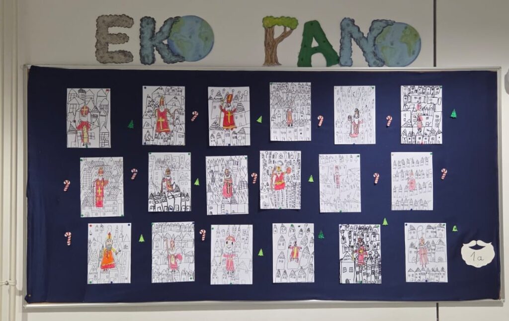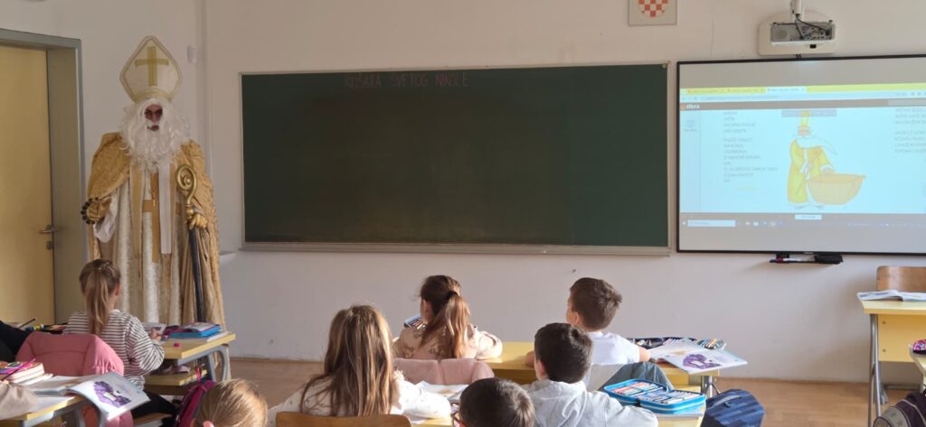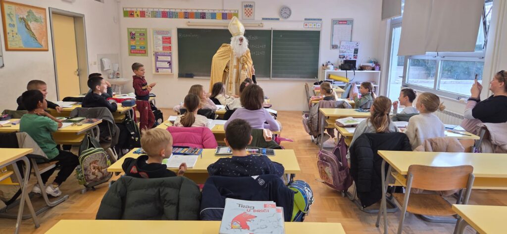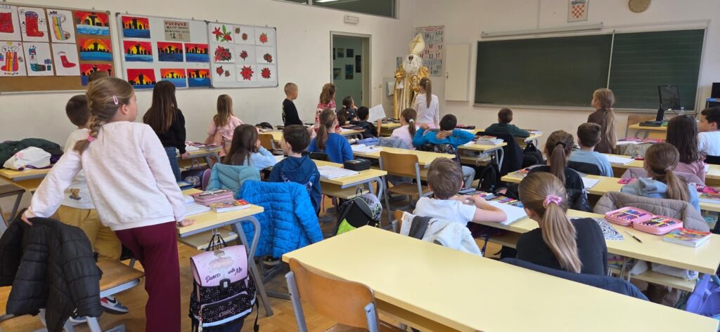 Povodom njegova blagdana, našu je školu posjetio upravo Sveti Nikola te je svojim dolaskom razveselio velike i male. Obišao je učenike u učionicama, srdačno ih pozdravio i s radošću se fotografirao s njima. Naši su se mališani posebno veselili susretu, a osmjesi su ispunili čitave hodnike. Sveti Nikola nije došao praznih ruku – svakom je učeniku darovao simboličan bombon, šireći dobro raspoloženje i toplinu. Učenici su se za njegov dolazak pripremili s velikim entuzijazmom. Kreativnim su radovima ukrasili svoje razredne panoe, posvetivši ih upravo svetom Nikoli. Crteži, poruke i prigodni ukrasi dali su školi blagdanski sjaj i stvorili posebno svečanu atmosferu.